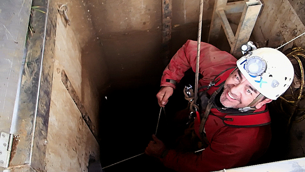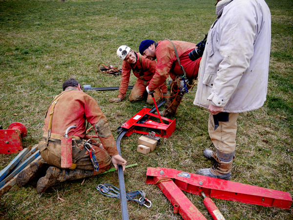 …Roland das Zugseil und später das Kabel mit Hilfe von Petra in den Schacht zieht
