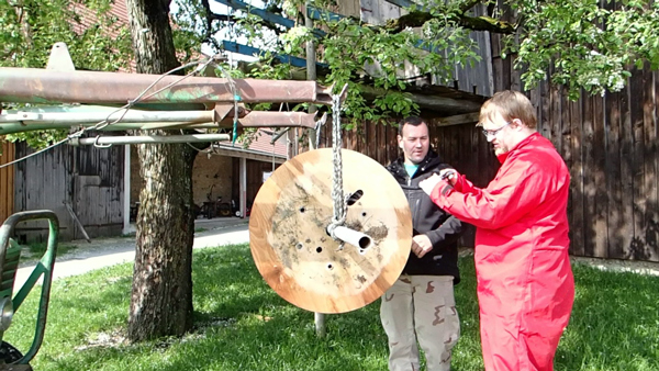 Und nun kam noch der Clou. Angeregt durch Kollegen aus einem Karstgebiet (Český kras) südwestlich von Prag, die für Grabungsarbeiten in einer Schachthöhle eine Hängebahn gebaut haben, machten sich Daniel Geil und Thomas Boldt Gedanken inwieweit das auch im Steebschacht umsetzbar ist und damit die Grabungsarbeiten wesentlich erleichtert werden könnten. So wurden in den letzten Wochen Hängebahnmodule gebaut und Daniel hat in seiner Werkstatt einen „Wagen“ konstruiert. Vor Ort werden die Module dann mit einer angepassten Biegemaschine gebogen und mit Konsolen am Schacht verschraubt. Die Premiere soll bis Ende August stattfinden.